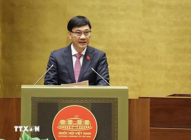 Chủ nhiệm Ủy ban Kinh tế của Quốc hội Vũ Hồng Thanh trình bày Báo cáo trước Quốc hội. (Ảnh: TTXVN)