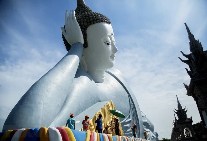 Du khám tham quan, chiêm bái Tượng Phật Thích Ca nhập niết bàn lớn nhất tại Việt Nam trong khuôn viên chùa Som Rong, phường 5, thành phố Sóc Trăng, tỉnh Sóc Trăng. (Ảnh: Hồng Đạt/TTXVN)