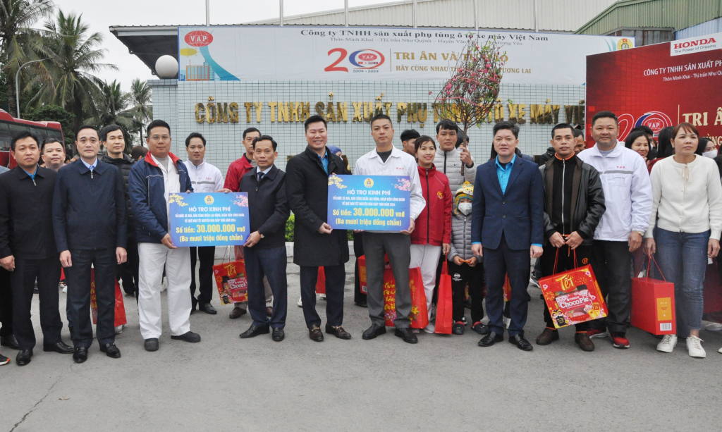 Tại Nhà máy Ống thép Hòa Phát, lãnh đạo LĐLĐ tỉnh và lãnh đạo huyện Văn Lâm trao 30 suất quà Tết tặng 30 công nhân lao động có hoàn cảnh khó khăn, mừng tuổi trẻ em là con công nhân lao động trên các chuyến xe và trao hỗ trợ 30 triệu đồng cho công đoàn cơ sở của đơn vị để thực hiện 7 chuyến xe, đưa gần 200 công nhân lao động về quê đón Tết. Đối với Công ty TNHH sản xuất phụ tùng ô tô xe máy Việt Nam, các đại biểu trao hỗ trợ 30 triệu đồng để công đoàn cơ sở thực hiện 12 chuyến xe đưa hơn 200 công nhân lao động về quê đón Tết; trao 51 suất quà Tết tặng công nhân và mừng tuổi cho trẻ em là con công nhân lao động trên các chuyến xe.