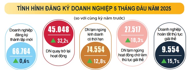 Đáng chú ý, nền kinh tế ghi nhận có hơn 45.000 doanh nghiệp quay trở lại hoạt động trong 5 tháng, tăng 32,2% so với cùng kỳ năm 2024. Như vậy, tổng số doanh nghiệp thành lập mới và quay trở lại hoạt động từ đầu năm đến nay đã lên hơn 111.800, tăng 11,3% so với cùng kỳ năm 2024.