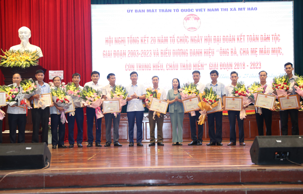 Nhân dịp này, 19 tập thể tiêu biểu trong công tác tổ chức Ngày hội Đại đoàn kết toàn dân tộc giai đoạn 2003 – 2023 và 40 gia đình tiêu biểu đạt danh hiệu “Ông bà, cha mẹ mẫu mực, con trung hiếu, cháu thảo hiền” giai đoạn 2018 – 2023 của thị xã được tuyên dương, khen thưởng.