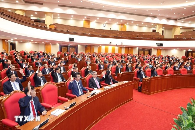 Các đại biểu biểu quyết thông qua Nghị quyết Hội nghị Trung ương lần thứ mười, khóa XIII. (Ảnh: Trí Dũng/TTXVN)
