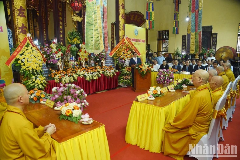 Phát biểu ý kiến, Thủ tướng Phạm Minh Chính trân trọng chuyển lời chúc mừng của Tổng Bí thư Nguyễn Phú Trọng đến đồng bào Phật giáo cả nước nhân Đại lễ Phật đản, đồng thời nhắc lại lời của Tổng Bí thư về tinh thần đại đoàn kết dân tộc, đoàn kết tôn giáo: "Việt Nam là đất nước đa dân tộc, đa tôn giáo, với 54 dân tộc anh em, nhiều tôn giáo cùng sinh hoạt tại các cộng đồng... Hiến pháp, pháp luật Việt Nam quy định tất cả mọi người dân đều có quyền theo hoặc không theo tôn giáo. Ở Việt Nam không có xung đột tôn giáo, xung đột dân tộc, tất cả chung sống hòa thuận...", vì mục tiêu hòa bình, hợp tác và phát triển.