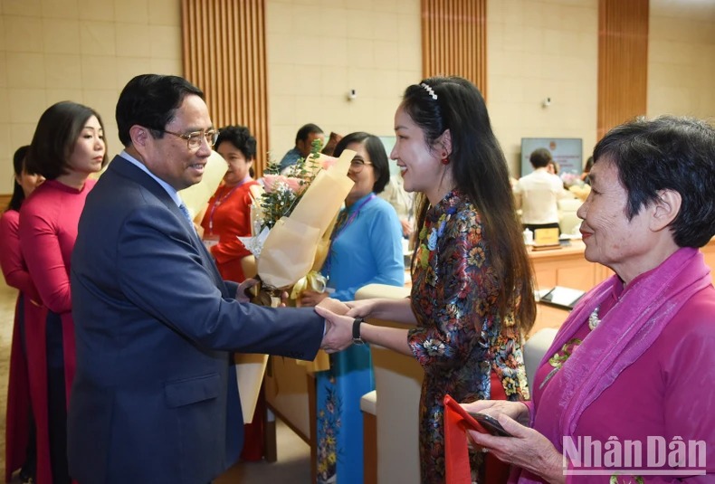 Thủ tướng Phạm Minh Chính tặng hoa chúc mừng các nữ đại biểu. (Ảnh: TRẦN HẢI)