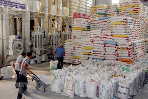 Đóng bao sản phẩm gạo xuất khẩu của Công ty TNHH gạo Vinh Phát ở thành phố Long Xuyên (An Giang). (Ảnh: Vũ Sinh/TTXVN)