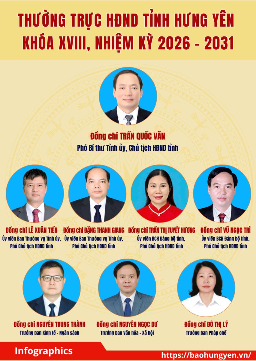 ại Kỳ họp thứ nhất, HĐND tỉnh Hưng Yên khóa XVIII đã bầu các chức danh Chủ tịch HĐND tỉnh, Phó Chủ tịch HĐND tỉnh, Trưởng các ban của HĐND tỉnh khóa XVIII, nhiệm kỳ 2026 - 2031. Báo và Phát thanh, Truyền hình Hưng Yên trân trọng giới thiệu danh sách Thường trực HĐND tỉnh Hưng Yên khóa XVIII.
