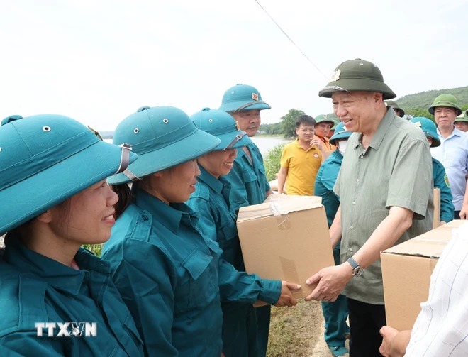 Tới thăm hỏi người dân đang được sơ tán tới Nhà văn hóa Thôn Phú Thọ 1, xã Trường Sinh, Tổng Bí thư, Chủ tịch nước Tô Lâm chia sẻ sâu sắc với người dân đang phải chịu ảnh hưởng do bão lũ gây ra, mong muốn người dân tiếp tục đoàn kết hỗ trợ nhau vượt qua khó khăn. Đảng, Nhà nước sẽ nỗ lực hết sức để sớm đưa cuộc sống của người dân trở lại bình thường.