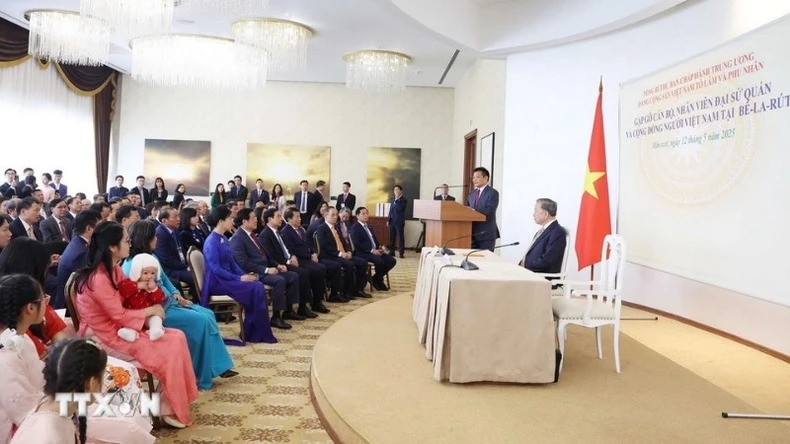 Trong khuôn khổ chuyến thăm cấp Nhà nước Cộng hòa Belarus, sáng 12/5 (giờ địa phương), Tổng Bí thư Tô Lâm và Phu nhân cùng Đoàn đại biểu cấp cao Việt Nam đã có cuộc gặp gỡ các cán bộ, nhân viên Đại sứ quán Việt Nam tại Belarus, đại diện cộng đồng người Việt Nam đang sinh sống, học tập và làm việc tại Belarus.