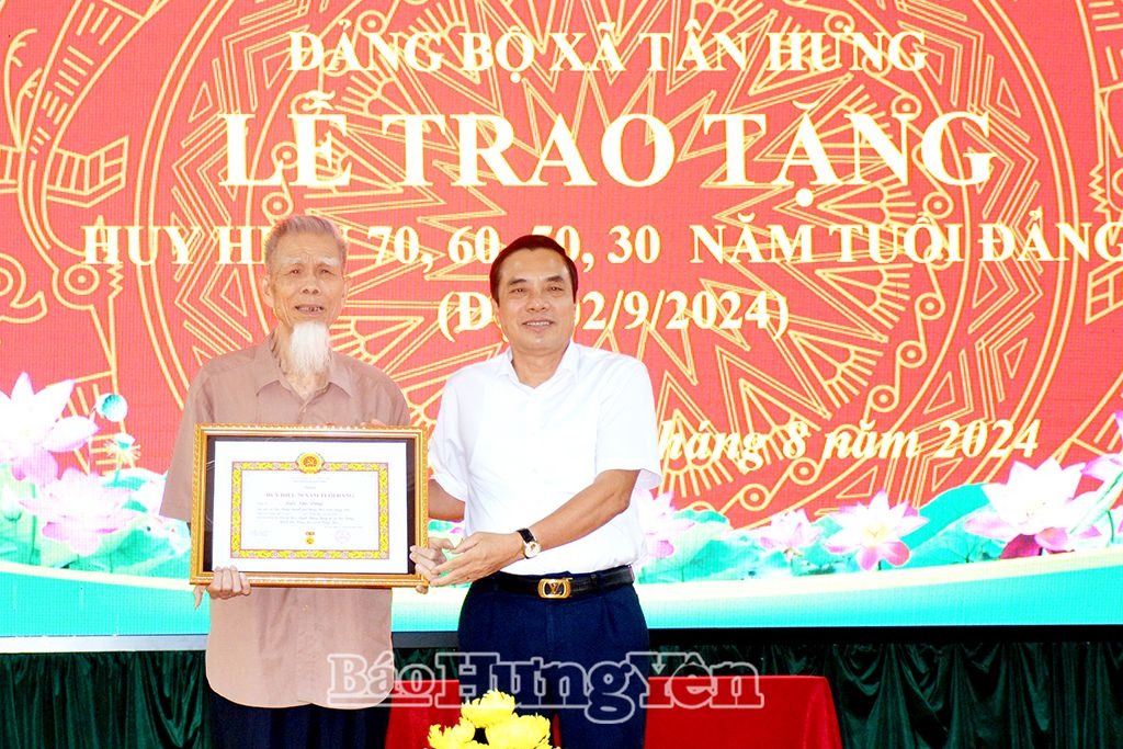 * Cùng ngày, Đảng bộ xã Tân Hưng (thành phố Hưng Yên) tổ chức Lễ trao tặng Huy hiệu Đảng đợt 2/9/2024. Đồng chí Phạm Huy Bình, Ủy viên Ban Thường vụ Tỉnh ủy, Bí thư Thành ủy Hưng Yên dự và trao huy hiệu Đảng tặng các đảng viên.