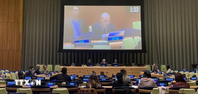 Công sứ Nguyễn Hoàng Nguyên, Đại biện lâm thời Phái đoàn Thường trực Việt Nam tại Liên hợp quốc, phát biểu tại diễn đàn. (Ảnh: Thanh Tuấn/TTXVN)