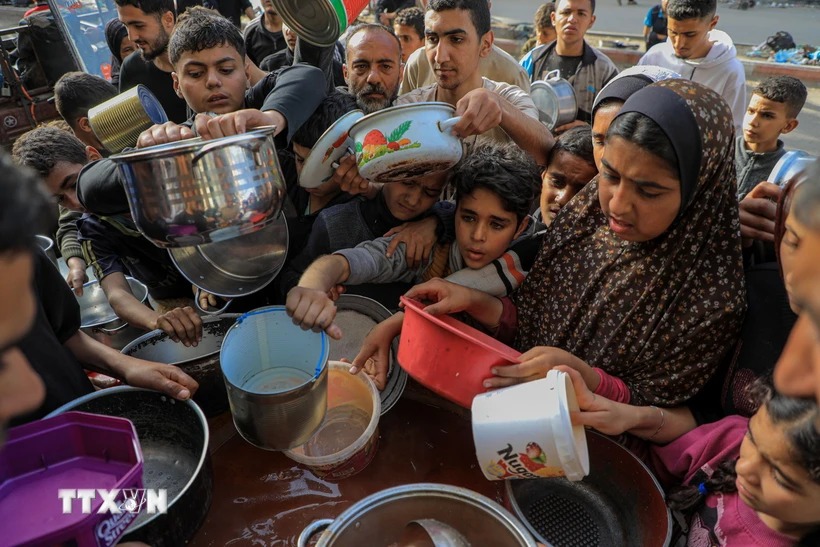 Người dân chờ nhận thức ăn cứu trợ tại thành phố Rafah, Dải Gaza, ngày 30/3/2024. (Ảnh: THX/TTXVN)
