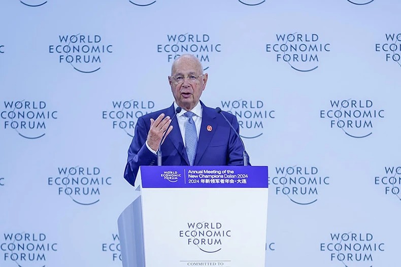 Nhà sáng lập kiêm Chủ tịch điều hành WEF Klaus Schwad phát biểu tại Phiên toàn thể Hội nghị WEF Đại Liên 2024.