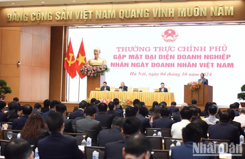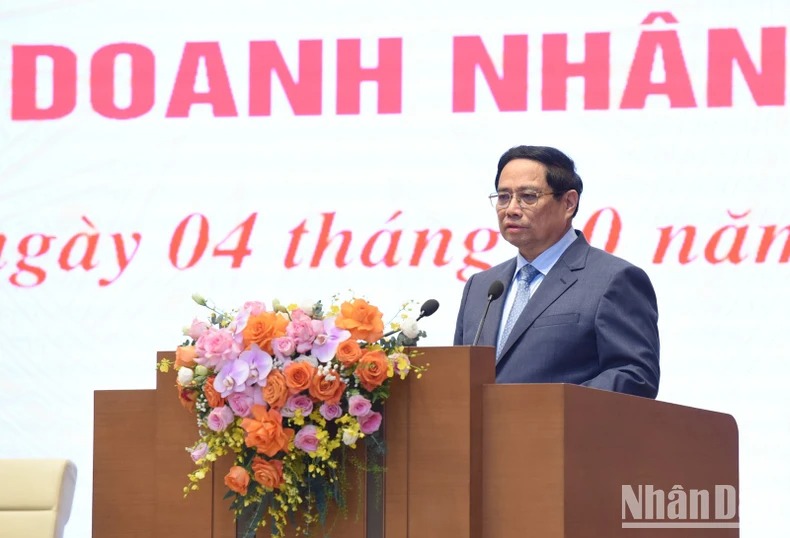 Thủ tướng Phạm Minh Chính chủ trì buổi gặp mặt của Thường trực Chính phủ với đại diện doanh nghiệp nhân Ngày Doanh nhân Việt Nam (Ảnh: TRẦN HẢI)