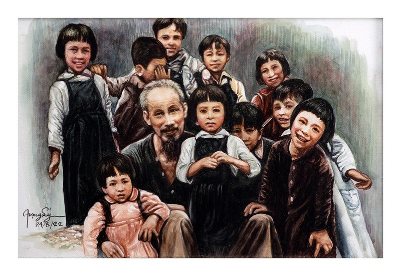 Một tác phẩm được trưng bày tại triển lãm “Tấm lòng của họa sĩ Việt kiều với Bác Hồ”. Ảnh: Bảo tàng Mỹ thuật Việt Nam cung cấp.