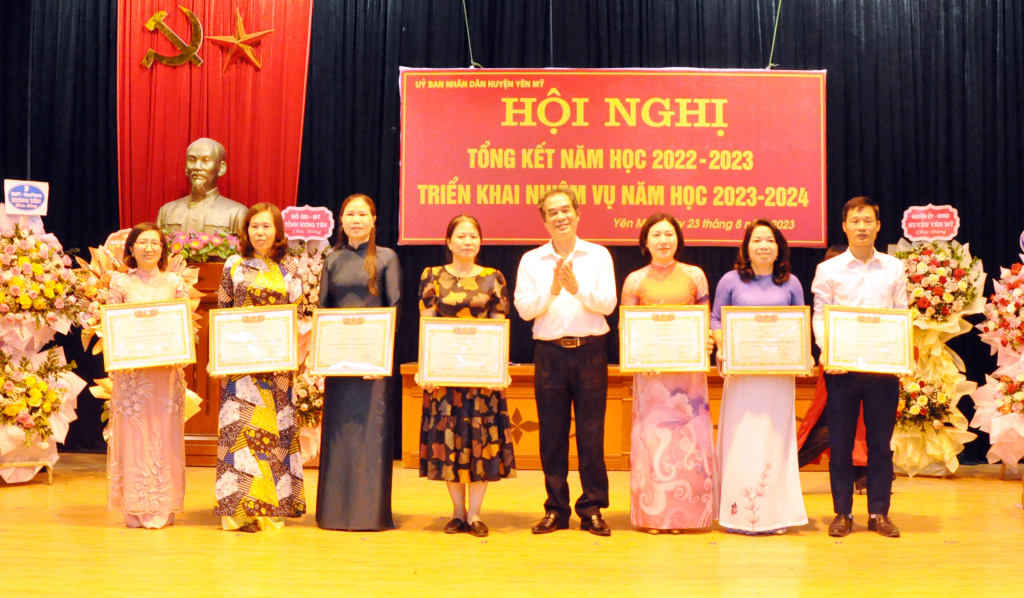 Lãnh đạo UBND huyện Yên Mỹ trao Bằng khen của Chủ tịch UBND tỉnh tặng các tập thể, cá nhân có thành tích xuất sắc trong năm học 2022-2023