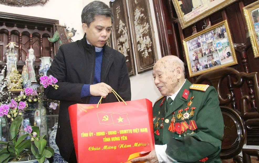 Đồng chí Trưởng ban Tuyên giáo và Dân vận Tỉnh ủy trao quà Tết tặng đảng viên Hoàng Văn Cửu, 78 năm tuổi Đảng, sinh hoạt tại Chi bộ thôn Xuân La, Đảng bộ xã Tiên La.
