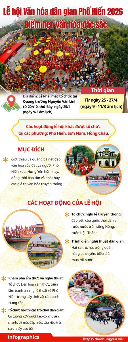 Lễ hội Văn hóa dân gian Phố Hiến năm 2026 được tổ chức quy mô cấp tỉnh từ ngày 25 - 27/4 (ngày 9 - 11 tháng Ba âm lịch). Trong suốt thời gian diễn ra lễ hội, nhiều hoạt động văn hóa đặc sắc được tổ chức sẽ mang đến trải nghiệm sống động, hấp dẫn cho người dân và du khách.