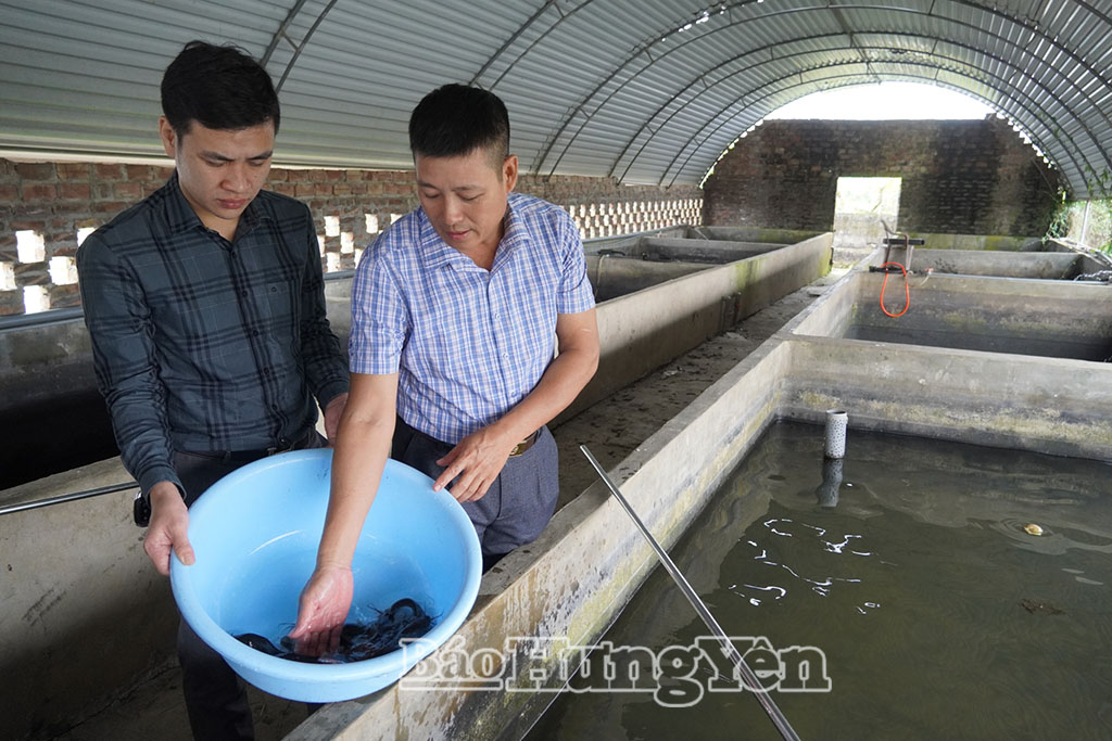 Ông Lưu Văn Dũng (bên phải), xã Quang Hưng sản xuất cá chạch sông giống bằng công nghệ ấp bình vây.