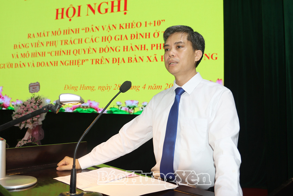 Sáng ngày 28/4, xã Đông Hưng tổ chức hội nghị ra mắt mô hình “Dân vận khéo 1+10” và mô hình “Chính quyền đồng hành, phục vụ người dân và doanh nghiệp” trên địa bàn xã. Đồng chí Nguyễn Văn Chiến, Ủy viên Ban Thường vụ Tỉnh ủy, Trưởng ban Tuyên giáo và Dân vận Tỉnh ủy dự hội nghị.